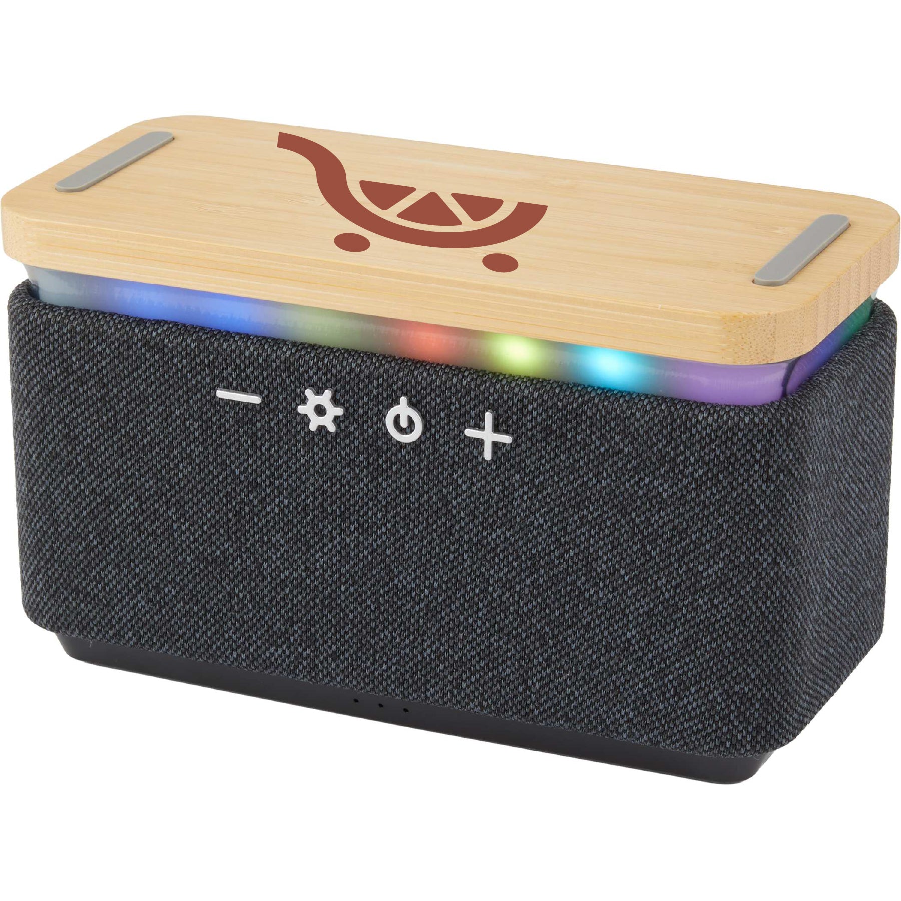 The Boost Fabric & FSC® Certified Bamboo Speaker with Wireless Charging Pad is perfect for the desk or countertop. The on-trend mixed-material appearance of the bamboo and RPET fabric wrap, combined with multi-color lights, will get anyone’s attention. The speaker's 5-Watt output produces crystal-clear sound. Plus, the top of the speaker is a 10-Watt wireless charging pad that charges any compatible device. For wireless charging, this speaker must be plugged in. The built-in 3000 mAh battery will keep the music playing for over 6 hours. Built-in music and light controls combined with a microphone allow for hands-free operation—Bluetooth® version 5.4. A 39� USB-A-to-Type-C charging Cable is included. The speaker's top is made from FSC® Certified bamboo. Each piece may look different due to the natural bamboo.